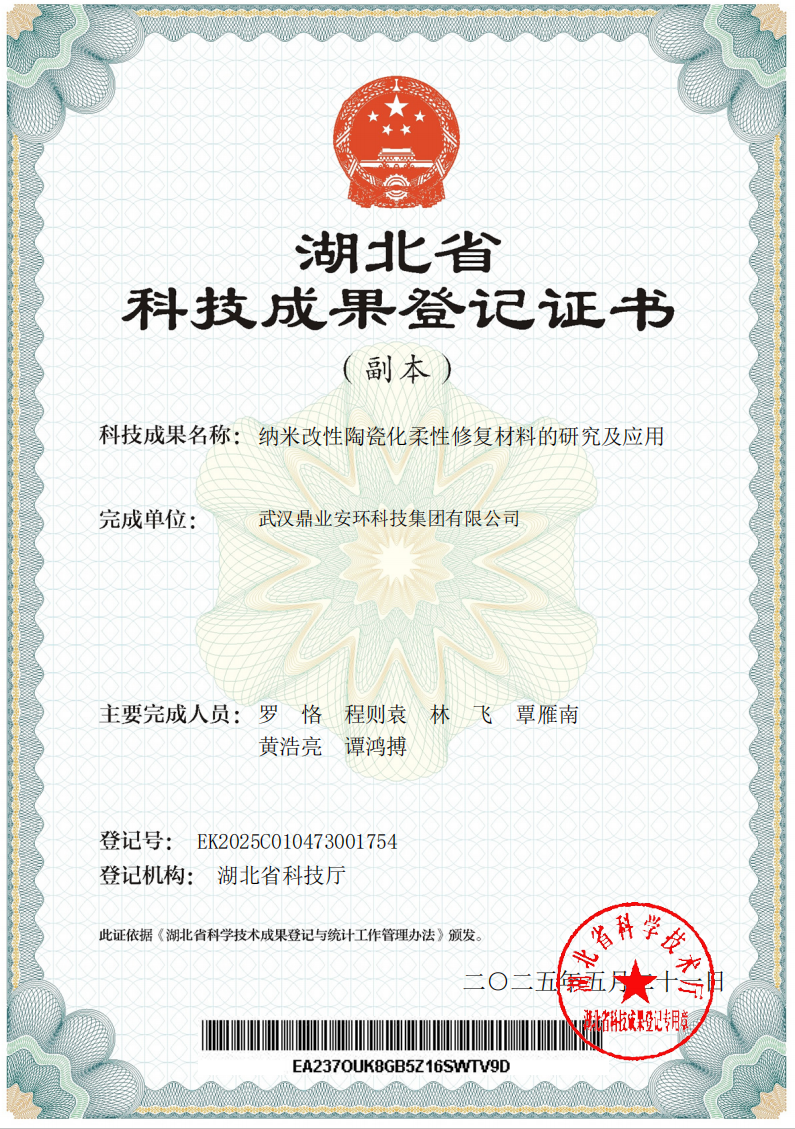 祝賀!武漢鼎業(yè)安環(huán)科技集團 《納米改性陶瓷化柔性修復材料的研究及應用》榮獲湖北省科技成果登記證書