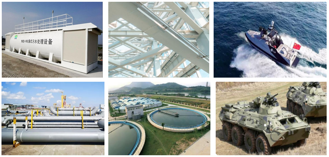 應(yīng)用于建筑、化工、冶金、電力、海洋、船舶、汽車(chē)制造、影視道具等眾多領(lǐng)域的抗爆防腐防水防護(hù)。